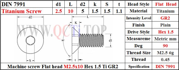 QCTI have DIN 7991 Titanium screws M2.5x4 M2.5x5 M2.5x6 M2.5x8 M2.5x10 M2.5x12 M2.5x14 M2.5x16 in stock.Flat head hex 1.5 Driver Ti GR2 Polished.No Magnetic